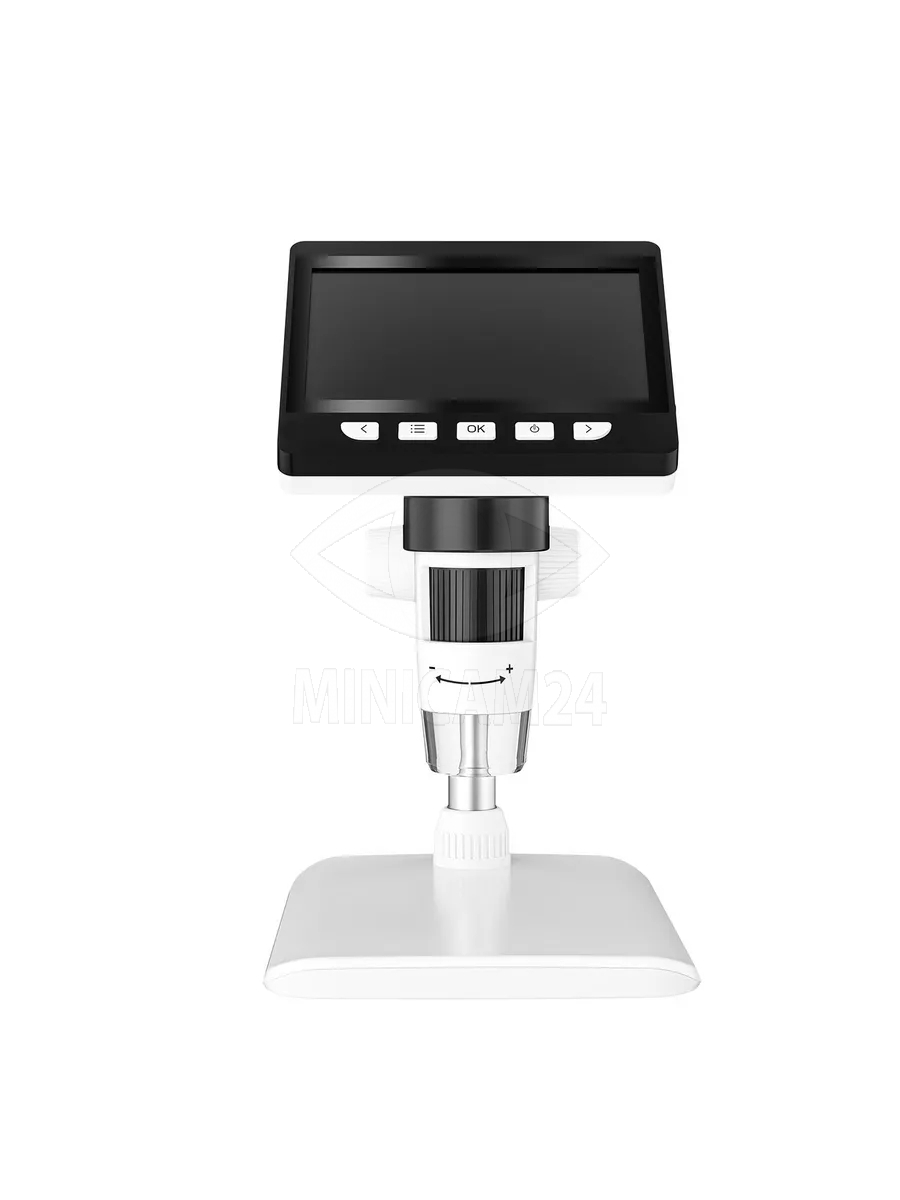 Настольный микроскоп на основе цифровой камеры с высоким разрешением. Прибор оснащен цветным дисплеем диагональю 4.3 дюйма и светодиодами подсветки предметного стола. Питание от встроенного аккумулятора рассчитанного на 5 часов непрерывной работы. Запись фото и видео на ПК производится по кабелю.